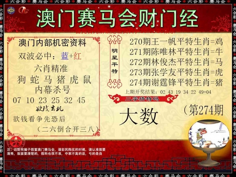 274期七肖 | 虎狗龙蛇羊牛猴 | 开:狗44 |